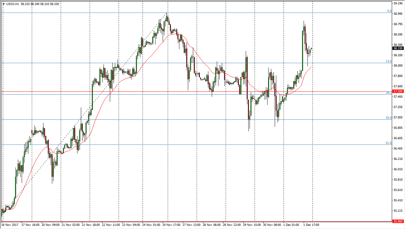The WTI Crude Oil market rallied significantly during the trading session on Friday, showing signs of strength based upon the US dollar falling more than anything else from what I can see. We dropped down to the $58 level, ended up bouncing enough to form a hammer, and then rallied from there a slightly towards the end of the session. I think that if the market goes looking towards the sin $59 level, we will continue to see more money flow into the market as we will make an attempt at $60. I don’t have any interest in shorting this market, least not yet but I recognize that oil is a very fluid and volatile market. The market continues to be very noisy and of course has to deal with the OPEC extension of production cuts, and then beyond that – Americans flooding the market at high values.