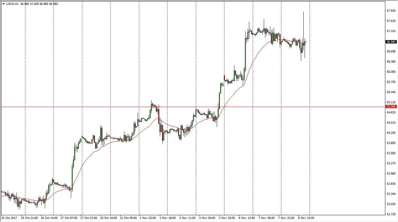 The WTI Crude Oil market tried to rally during the day on Wednesday, but got be back at the $58 level. I think that we are going to drift a little bit lower from here, but I also recognize her should be a bit of a floor in the market near the $55 level. This pullback should be a buying opportunity, so if you are looking towards the longer-term move, you are probably best suited to be patient and wait for a supportive candle at lower levels, especially near the $55 level. Ultimately, this is a market that has been very bullish in the short term, and I think that should continue to be the case, at least until we reach the $60 level where I would anticipate much more resistance. However, if we were to break down below the $55 level, I think at that point we could roll over little bit farther.