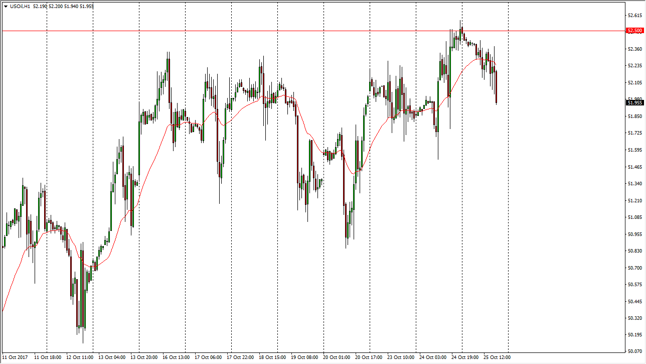 The WTI Crude Oil market broke down significantly during the day on Wednesday, testing the $52.50 level IV resistance, and then rolling over. This is also in reaction to a larger than anticipated inventory build, as it shows we continue to struggle to burn off the massive oversupply of crude. I think if we can break down below the $51.50 level, the market could drop significantly. Alternately, if we get some type of supportive candle, we may try to reach towards the $52.50 level above again, and a break above there would be very bullish. Overall, I think the one thing that probably is almost guaranteed is going to be choppiness and volatility, as we have seen for quite a while now. I think a break above the 52.50 region allows the market to free itself towards the $55 level above. Until then, I think that the market is probably best traded from the short-term only.