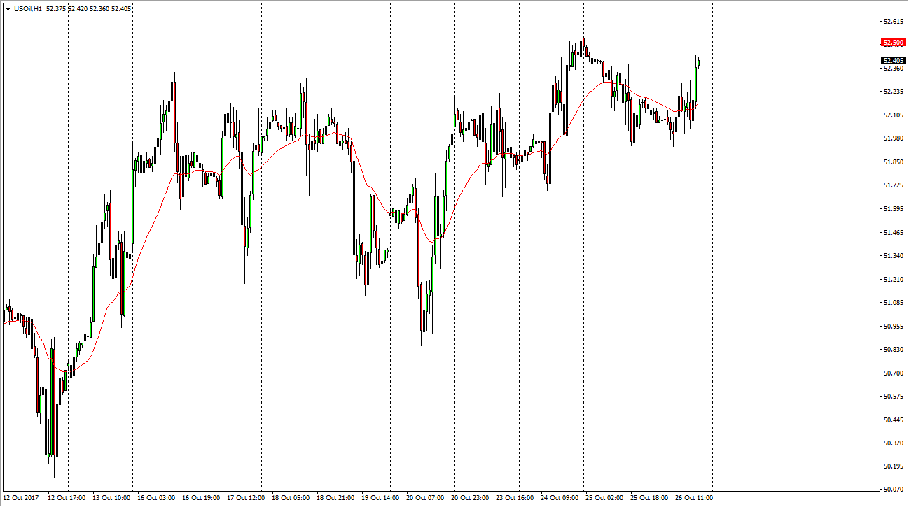The WTI Crude Oil will be awaiting the Baker Hughes Oil Rig Count today, the as we approach the $52.50 handle. This is an area that I expect to see significant resistance, but if we can break above there solidly, the market is probably ready to go to the $55 level next. Pullbacks will more than likely find support below at the $52 region, and I think that the volatility will probably continue to push this and upward manner. However, if we were to break down below the $51.75 level, at that point I would expect the market to roll over a bit, perhaps dropping down to the $51 handle. Recently though, it seems as if the buyers are very resilient, and I think that leads to higher pricing.