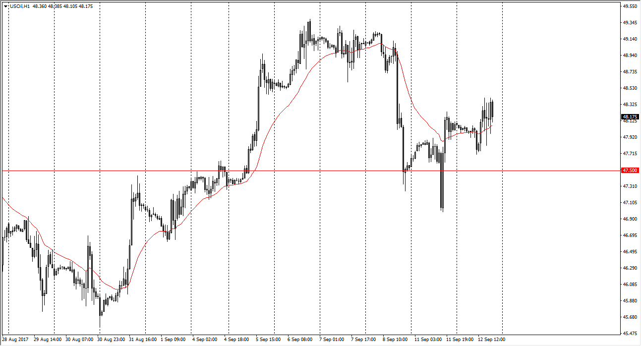 The WTI Crude Oil market had a slightly positive session on Tuesday, as we await the inventory numbers today. Because of this, I don’t read too much into the daily action but I think it’s only a matter of time before the inventory number has its influence. I suspect that the $49 level above will be resistive, and although we have had a bit of a relief rally due to the less destructive forces of hurricane Irma, thereby allowing demand for crude oil to remain, there is still a significant issue with pricing in the market. We are simply oversupplied of crude oil, and will continue to be so for the near future. OPEC is already trying to talk up the price of crude oil, suggesting that perhaps more production cuts could calm. However, the market is rapidly learning that OPEC doesn’t have the control it once did of supply.