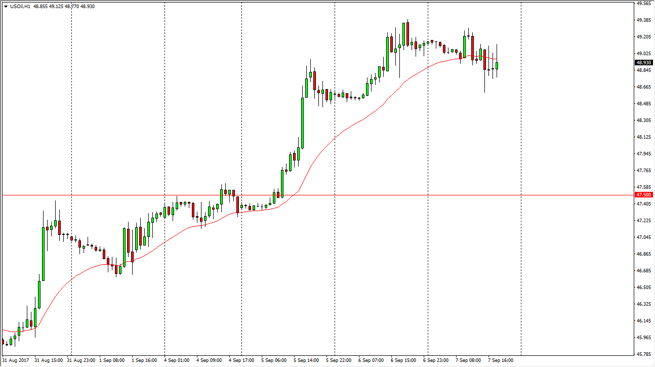 The WTI Crude Oil market went sideways, fell a bit, human rallied. Ultimately, the market looks as if it is trying to figure out what to do about hurricane Irma, so it is can be very difficult to decide where to go next. Ultimately, I think that the market could go looking towards the $50 level above. I think that level will be resistance, but if we break above there, the market should then go to the $51 handle. Alternately, if it looks as if hurricane Irma is going to turn around and avoid the oil rigs in the Gulf, we could see a turnaround in this move. Expect extreme amounts of volatility as we are literally trading the weather.