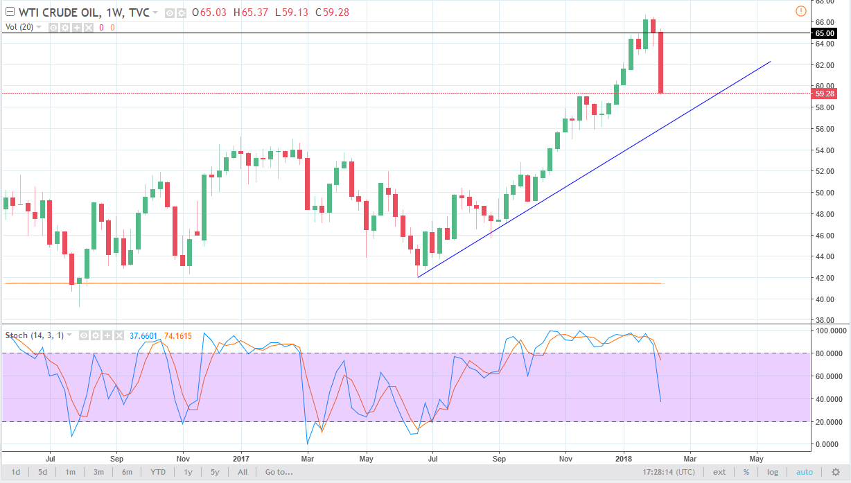 Brent markets broke down during the week, slicing through the $65 level, and look likely to go down to the $60 level. We have already broken down below the uptrend line, so I think we are going to continue to see selling pressure. If the US dollar starts to rally again, that will of course put even more pressure on this market. Ultimately, I think that the market breaking below the $60 level should send this market much lower, perhaps down to the $56 level. That’s an area that should be supportive, but at this point I think rallies are selling opportunities and I think that the $70 level is probably the highs for the year. Ultimately, this is a market that should be volatile, but I think the oversupply is going to overwhelm the market in general. Ultimately, I think that market has gotten far too ahead of itself.