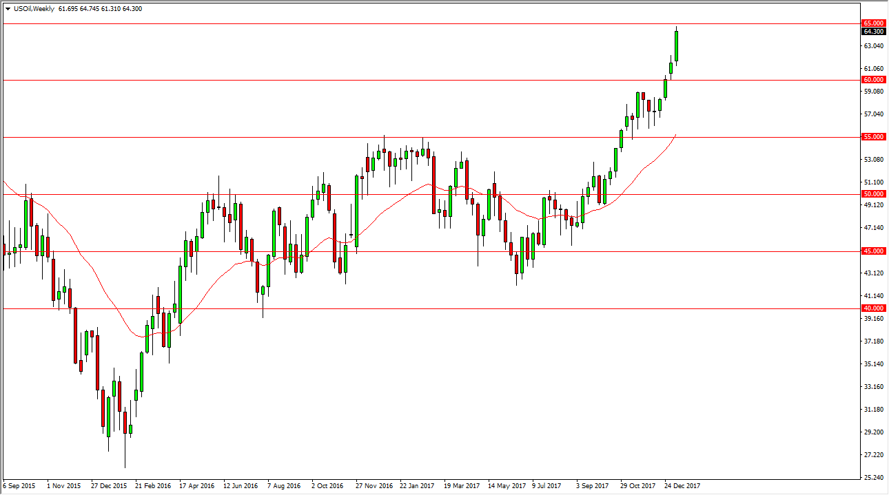 The WTI Crude Oil market exploded to the upside during the course of the week, especially on Friday. It looks like we are going to test the $65 level above, which of course is an area that is psychologically important. We are bit overextended, so I think that a pullback is very possible. The $60 level underneath should be a bit of a “floor” in the market, so I don’t have any interest in trying to short this market, I think that the pullback will offer value the people are willing to take advantage of that deal with this market. Short-term traders might be willing to sell, but longer-term, buying is the only thing that you can do.