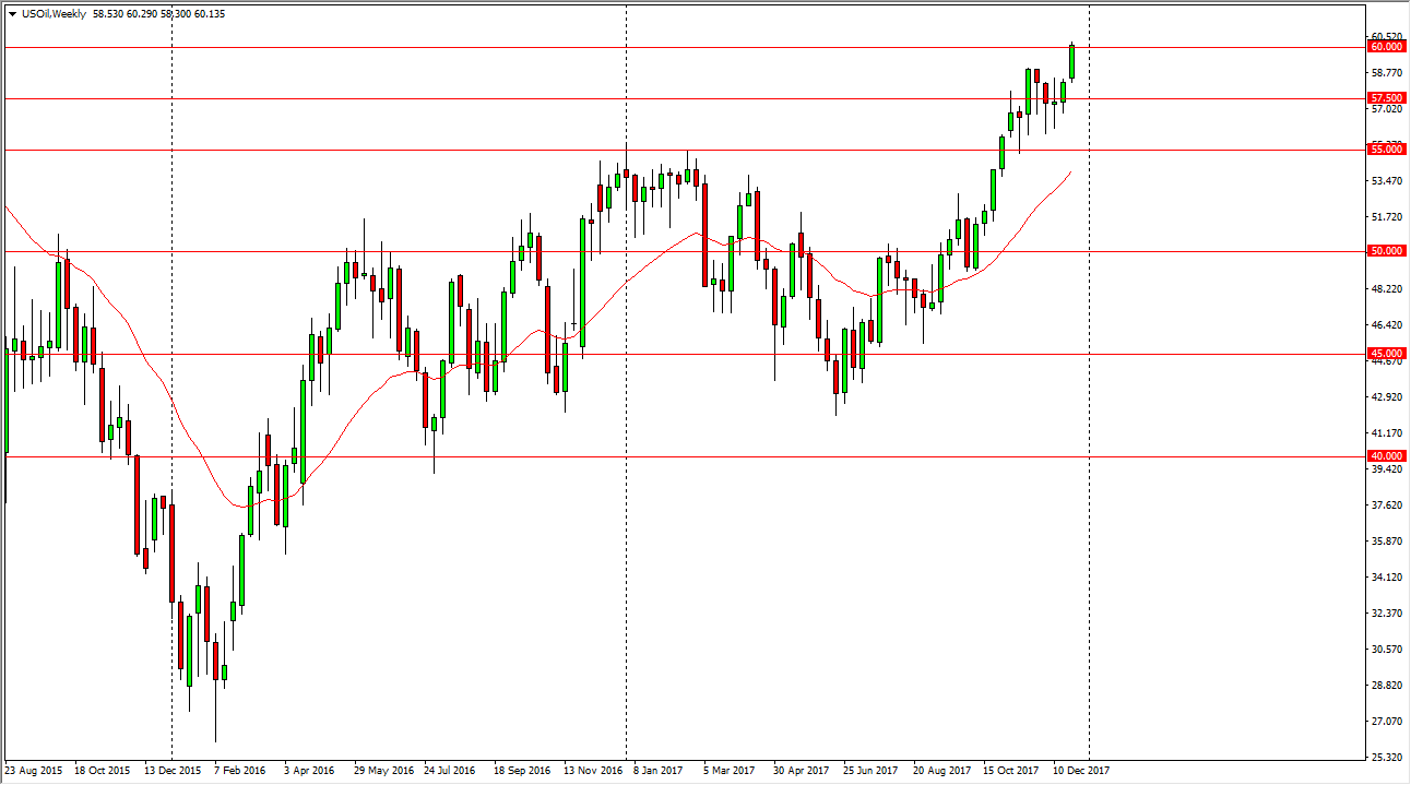 The WTI Crude Oil market rallied during the week, breaking above the $60 handle for the first time in ages. This is the high of the year, and it looks likely that we will continue to go higher, at least over the short term. I think that pullbacks are likely, but the $57.50 level should be the floor. If we were to break down below there, I think we could probably drop to the $55 level next. Eventually, I believe that we will go looking towards the $62.50 level, and if tensions in the middle east rise between Iran and Saudi Arabia, that could be another catalyst to push the oil markets higher.