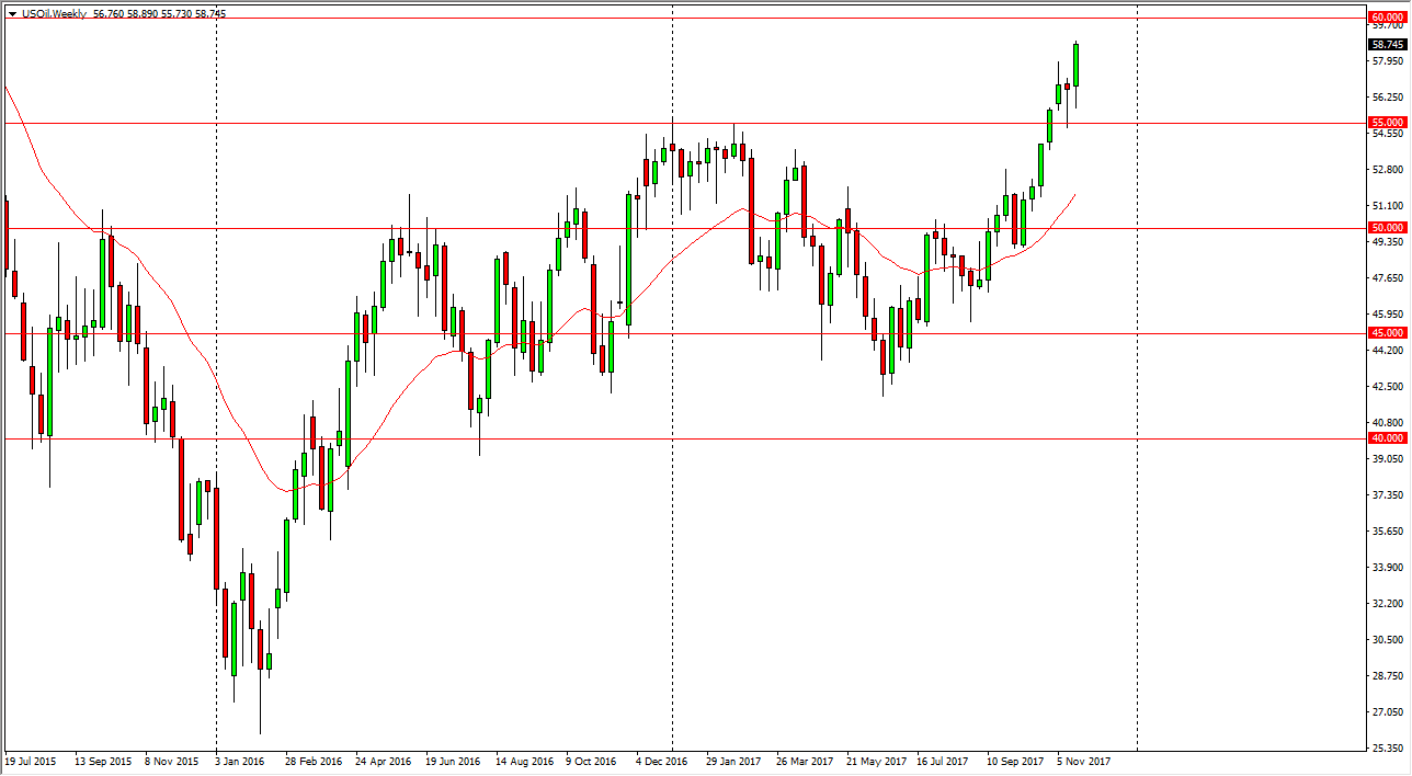 The WTI Crude Oil market initially fell during the trading week, but found enough buyers just above the $55 level to turn around and rallied significantly. Because of this, it looks as if the market could reach towards the $60 level this week, and certainly there is plenty of bullish momentum underneath. The $55 level now looks as if it is going to act as a short-term “floor” in the market, and that we could even break be on the $60 level to go much higher. I think that crude oil will continue to get a boost as long as there are tensions in the Middle East, with the Saudis and Iranians saber rattling. Ultimately, this is a market that I think will find a lot of pressure from above, but American drilling hasn’t had a major effect yet.