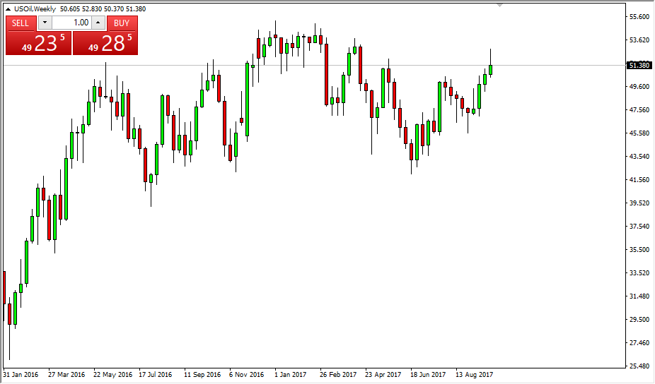 If the West Texas Intermediate markets look a bit soft, the Brent market looks horrible. We ended up forming a massive shooting star right above the $59 level, and are closing the week saw the $57. I believe that a breakdown below the weekly candle shoots in this market much lower, as it looks like we have gotten far ahead of ourselves. We could be looking at a move down to the $55 level, followed by the $52.50 level after that. The oversupply of oil continues to be an issue, and there doesn’t seem to be much that can be done about it. With the crude oil markets rebounding production capability the way they have after the hurricane and threats out of OPEC, I just don’t see where a longer-term rally can be sustained. Because of this, we have almost certainly gotten ahead of ourselves, and this pullback should be healthy at the very least, if not destructive to the uptrend.