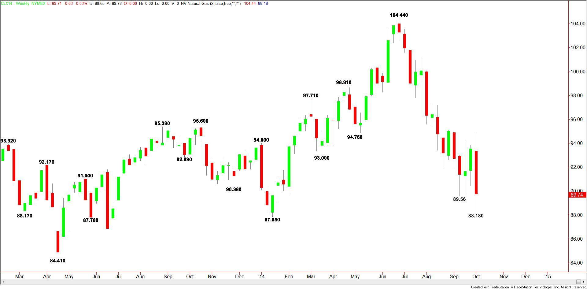 November Crude Oil futures plunged last week and are now in a position to challenge the low for the year at $87.85. This is followed by the April 2013 bottom at $84.41.
