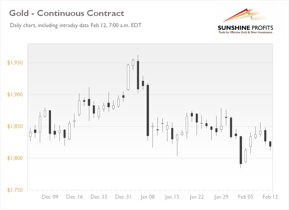 The gold futures contract lost 0.86% on Thursday, as it retraced some of its short-term rebound from last Thursday’s local low of $1,784.60. Last week it broke below the previous local low and $1,800 price mark following strengthening U.S. dollar and rallying stock market, among other factors. The market gave back almost all of December’s advance. This week gold bounced back higher, as we can see on the daily chart ( the chart includes today’s intraday data ):