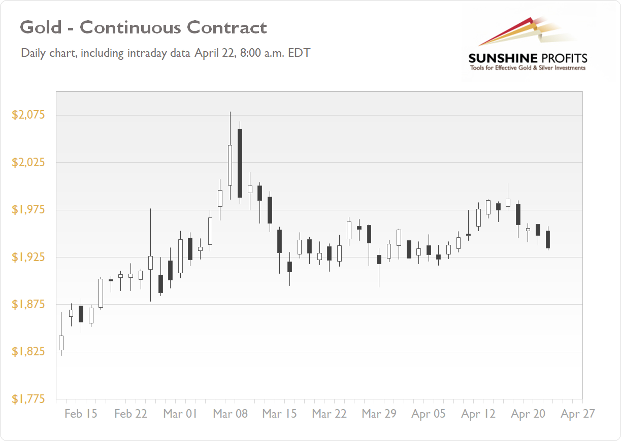 The gold futures contract lost 0.38% on Thursday, Apr. 21 following its Wednesday’s decline of 0.2%, as it fluctuated within a short-term consolidation after bouncing off the $2,000 price level. The market reacted to the strenghtening U.S. dollar, among other factors. This morning the yellow metal is trading lower, as we can see on the daily chart (the chart includes today’s intraday data):