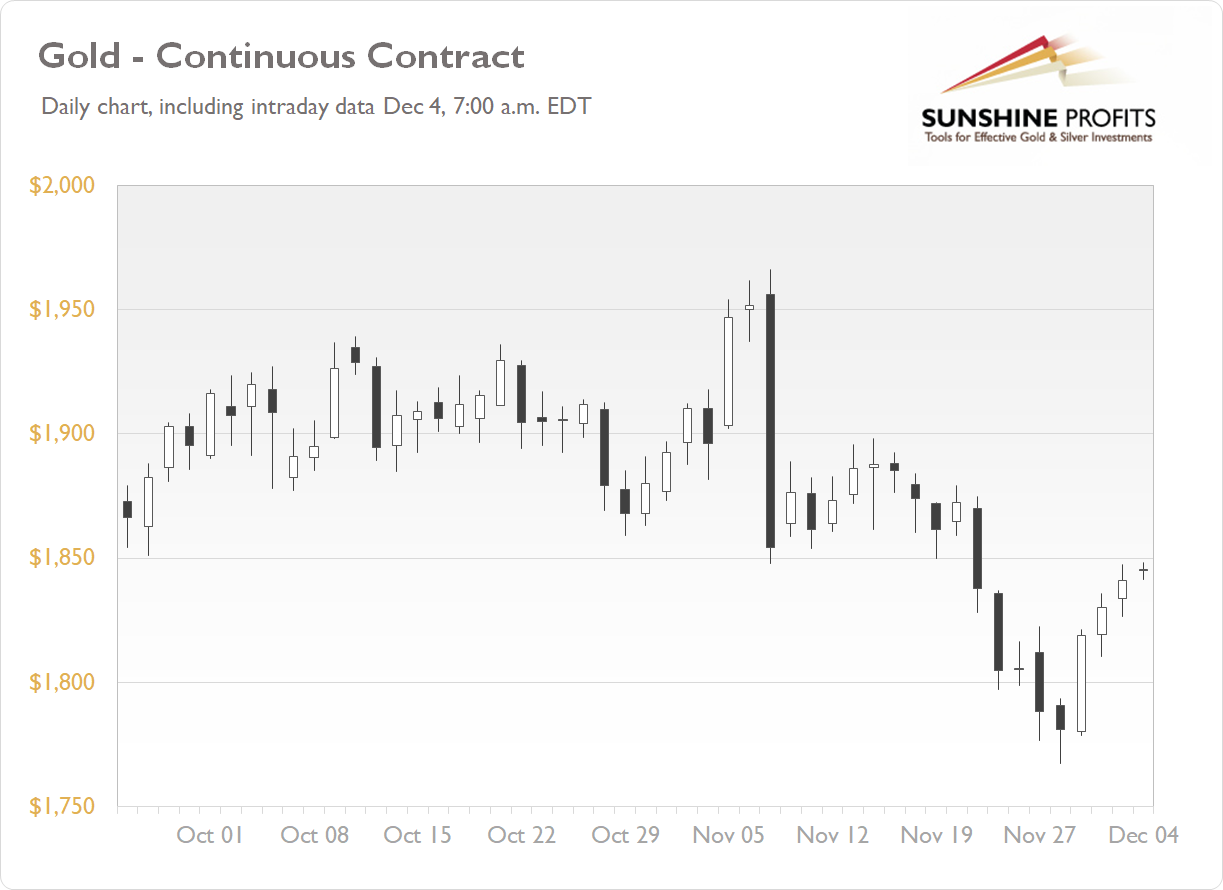 The gold futures contract gained 0.60% on Thursday, as it extended its short-term uptrend. On Monday the market has reached a new low following breaking below the recent local lows along the price level of $1,850. More than three weeks ago gold sold off 5% in one day after global financial markets’ euphoria rally in reaction to Covid-19 Pfizer’s vaccine news release. Last week there has been a breakdown below $1,850, as we can see on the daily chart ( the chart includes today’s intraday data ):