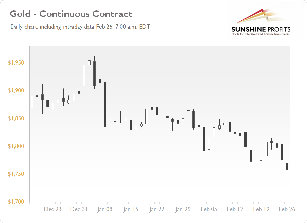 The gold futures contract lost 1.25% on Thursday, as it retraced all of its Monday’s rebound of 1.7%. Last week it broke below the previous local low and $1,800 price level. The market gave back all of December’s advance. This morning gold is trading at new local low, as we can see on the daily chart ( the chart includes today’s intraday data ):