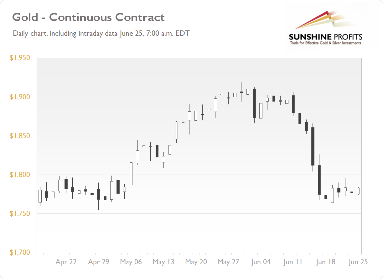 The gold futures contract lost 0.38% on Thursday, as it extended its short-term consolidation following last week’s $100 decline. On June 1 gold price was the highest since early January. In April the market has bounced from the support level marked by March 8 local low of $1,663.30. Since then it has been advancing. This morning gold is further extending its consolidation, as we can see on the daily chart (the chart includes today’s intraday data):