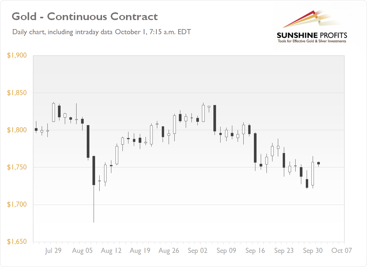 The gold futures contract gained 1.98% on Thursday, as it retraced its recent declines after breaking below the $1,750 price level. The market followed a downward correction in U.S. dollar and falling stock prices. Gold is back above that $1,750 level again. This morning gold is trading along yesterday’s daily closing price, as we can see on the daily chart (the chart includes today’s intraday data):