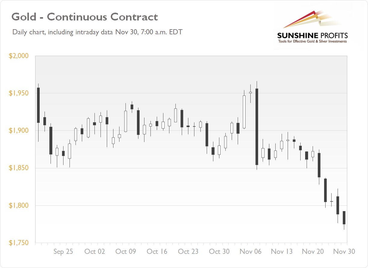 The gold futures contract lost 0.96% on Friday, as it extended its short-term downtrend following breaking below the recent local lows along the price level of $1,850. Three weeks ago on Monday gold sold off 5% in one day after global financial markets’ euphoria rally in reaction to Covid-19 Pfizer’s vaccine news release. The yellow metal came back down to $1,850 price level. Last week there has been a breakdown below that support level, as we can see on the daily chart ( the chart includes today’s intraday data ):