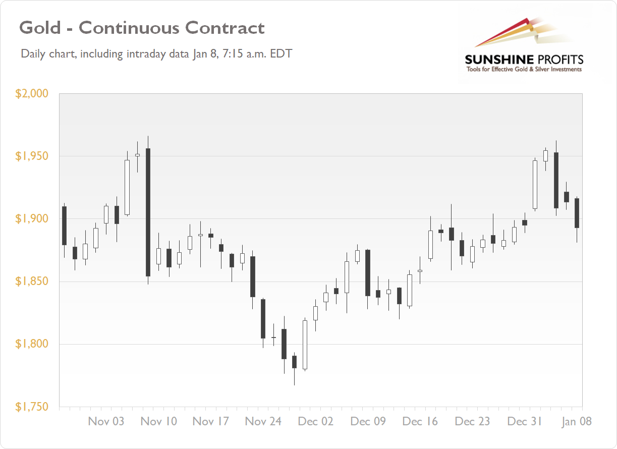 The gold futures contract gained 0.26% on Thursday, as it fluctuated following its Wednesday’s decline of 2.3%. In late November the market has reached a new local low below $1,800 price level. Since then it has been retracing the whole decline. The yellow metal got closer to its early November local high of $1,966.10 this week but then it has retraced the advance, as we can see on the daily chart ( the chart includes today’s intraday data ):