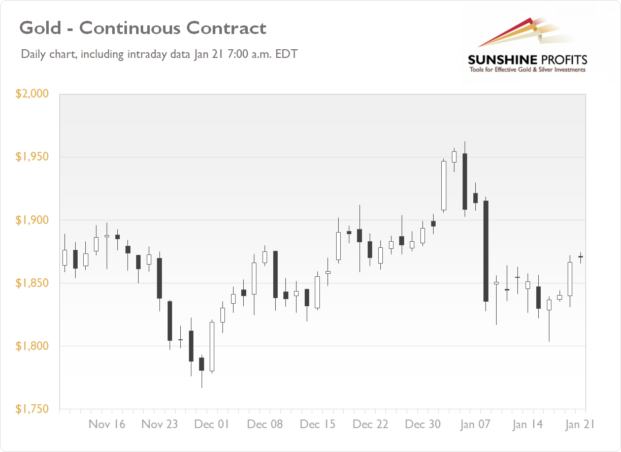The gold futures contract gained 1.43% on Wednesday, as it broke above the recent trading range after bouncing from local low of around $1,800 on Monday. The market gave back almost all of its December’s advance recently. This week, gold is retracing some of its early January decline, as we can see on the daily chart ( the chart includes today’s intraday data ):