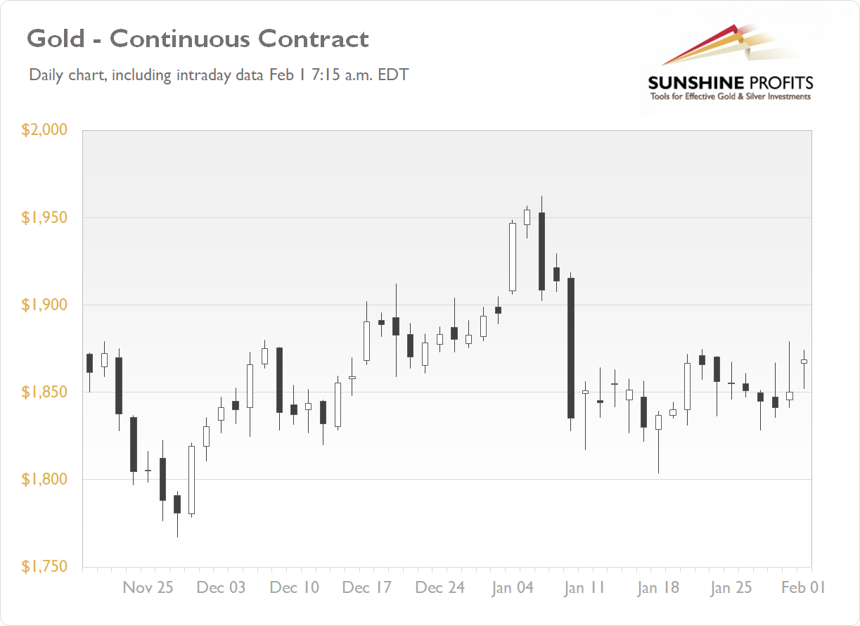 The gold futures contract gained 0.49% on Friday, as it remained within a short-term consolidation. The market gave back almost all of December’s advance in early January. Recently gold retraced some of that decline. Today it’s trading close to short-term local highs, as we can see on the daily chart ( the chart includes today’s intraday data ):