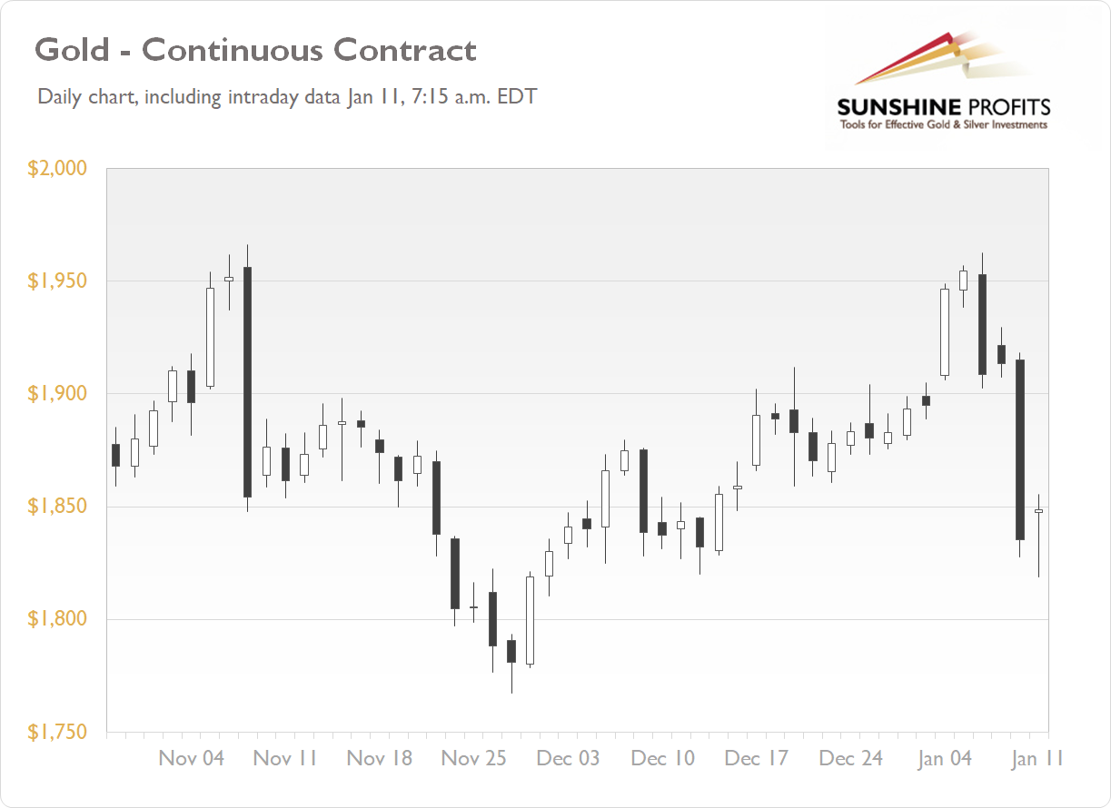 The gold futures contract lost 4.09% on Friday, as it quickly retraced most of the December’s advance. In late November the market has reached new local low below $1,800 price level. Since then it has been retracing the decline. Last week, the yellow metal got closer to its early November local high but then it has retraced the whole advance, as we can see on the daily chart ( the chart includes today’s intraday data ):