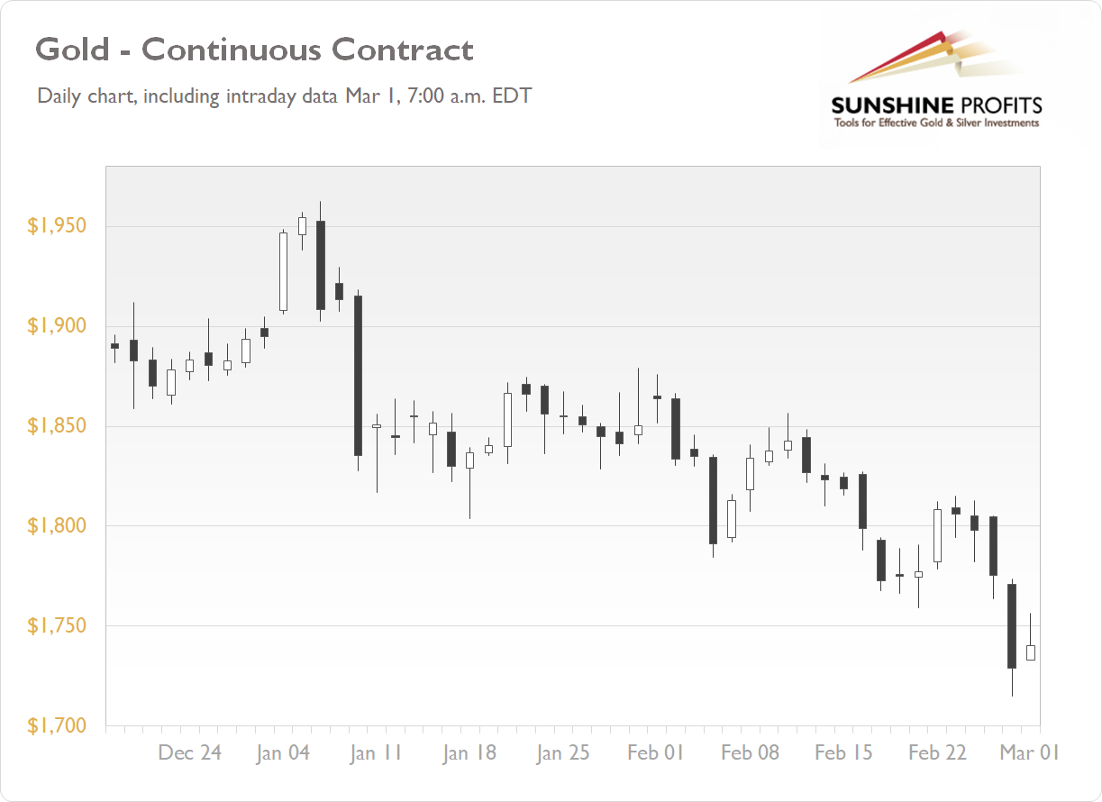 The gold futures contract lost 2.62% on Friday, as it broke below the previous local low and a short-term support level of $1,750. The market is the lowest since mid-June of 2020 following strengthening U.S. dollar, among other factors. This morning gold is trading closer to $1,750 mark again, as we can see on the daily chart ( the chart includes today’s intraday data ):