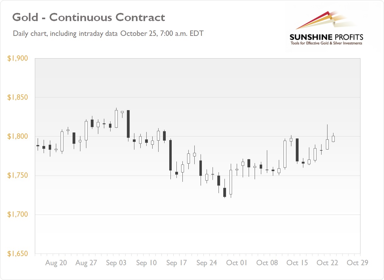 The gold futures contract gained 0.81% on Friday, as it fluctuated along the $1,800 price level. The daily high was at $1,815.50 but its closing price fell slightly below the $1,800 level. Gold was the highest since Sep. 7 following weakening U.S. dollar and rising stock markets, among other factors. This morning gold is trading along the $1,800 level, as we can see on the daily chart (the chart includes today’s intraday data):