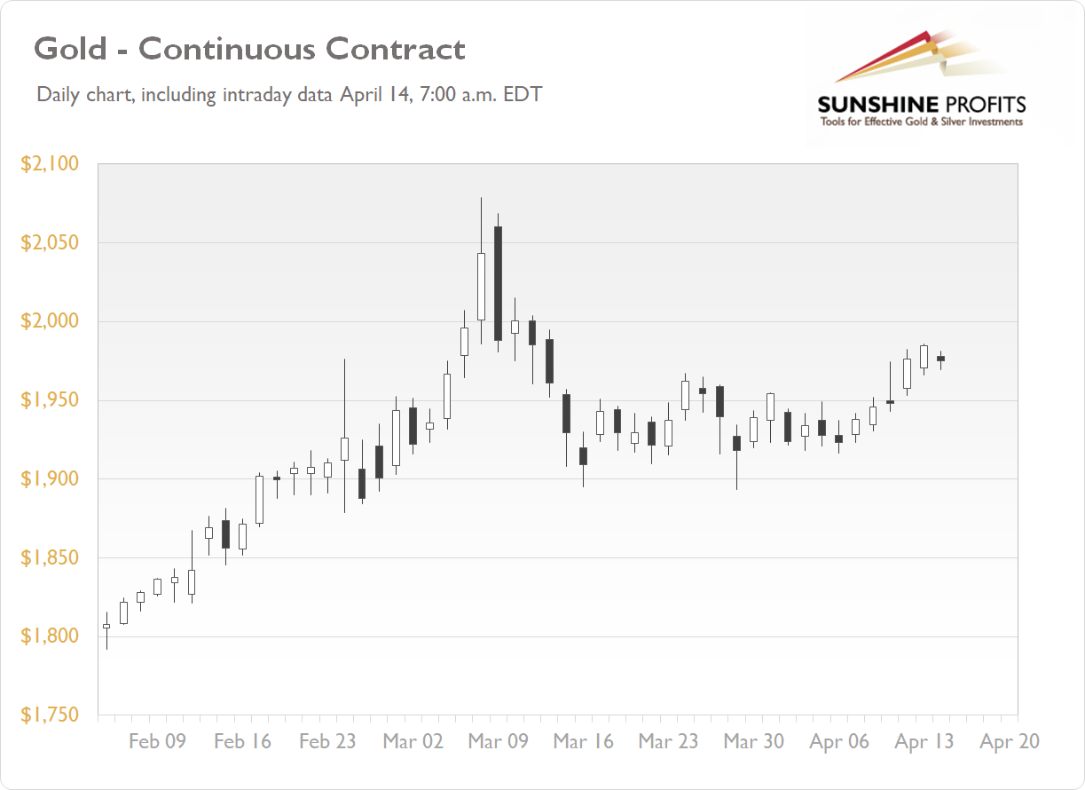 The gold futures contract gained 0.44% on Wednesday, Apr. 13, as it extended a short-term uptrend after breaking above the $1,950 price level. The yellow metal’s price was the highest since mid-March on worries about inflation and Russia-Ukraine conflict. This morning gold is retracing some of yesterday’s advance, as we can see on the daily chart (the chart includes today’s intraday data):