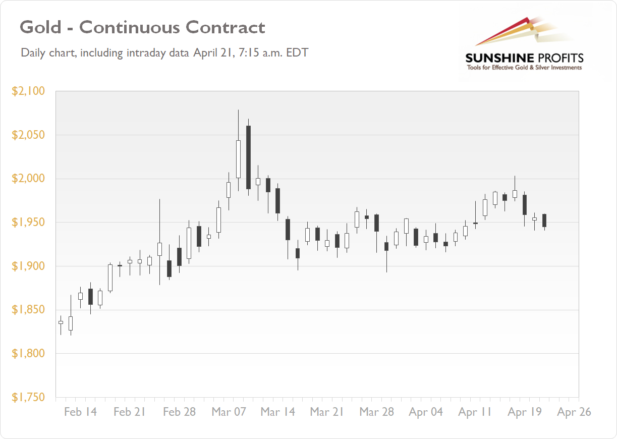 The gold futures contract lost 0.17% on Wednesday, Apr. 20, as it fluctuated following Tuesday’s decline of 1.4%. Gold retraced its recent advances after bouncing from the $2,000 price level. The market reacted to the streghtening U.S. dollar, among other factors. This morning the yellow metal is trading closer to the local lows, as we can see on the daily chart (the chart includes today’s intraday data):