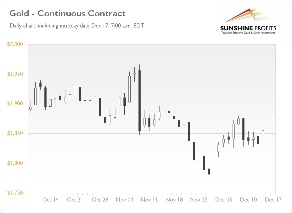 The gold futures contract gained 0.20% on Wednesday, as it retraced the whole of its last week’s decline. In late November the market has reached a new low after breaking below local lows along the price level of $1,850. Today gold is breaking above the previous local high following yesterday’s FOMC release, as we can see on the daily chart ( the chart includes today’s intraday data ):