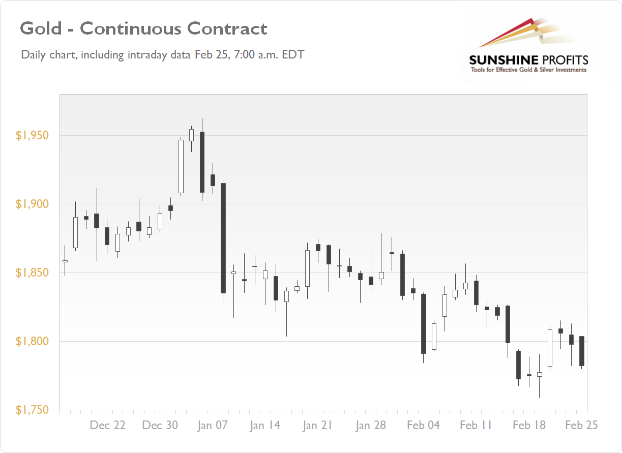 The gold futures contract lost 0.44% on Wednesday, as it retraced some of its Monday’s rebound of 1.7%. Last week it broke below the previous local low and $1,800 price level. The market gave back all of December’s advance. This morning gold is trading along yesterday’s daily low, as we can see on the daily chart ( the chart includes today’s intraday data ):