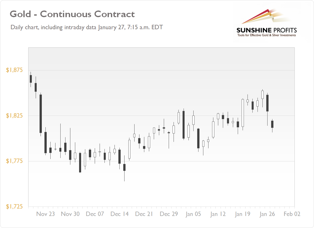 The gold futures contract lost 1.23% on Wednesday following the FOMC Statement release. The precious metals’s prices reacted to the strengthening U.S. dollar. Recently gold fluctuated below the $1,850 level after breaking above the previous short-term consolidation. Yesterday, the market came back to that previous trading range and it got closer to the $1,800 level again. This morning yellow metal is extending its short-term downtrend slightly, as we can see on the daily chart (the chart includes today’s intraday data):