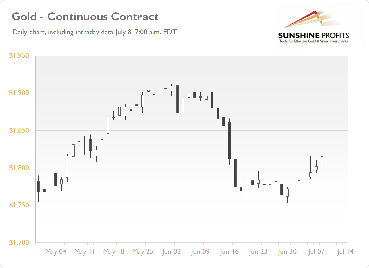 The gold futures contract gained 0.44% on Wednesday, as it continued to trade above $1,800 price level. On Tuesday the market broke above the recent consolidation following a $100 decline. This morning gold is extending its short-term uptrend, as we can see on the daily chart (the chart includes today’s intraday data):