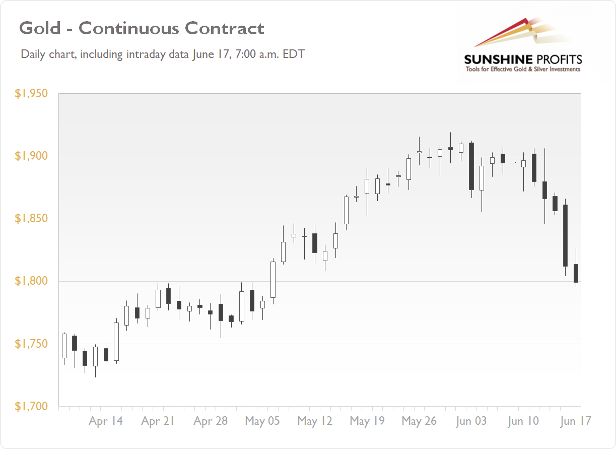 The gold futures contract lost 2.40% on Wednesday, as it broke below its recent local lows following the FOMC Statement release. On June 1 gold price was the highest since early January. In April the market has bounced from the support level marked by March 8 local low of $1,663.30. Since then it has been advancing. This morning gold is trading close to $1,800 price level, as we can see on the daily chart (the chart includes today’s intraday data):