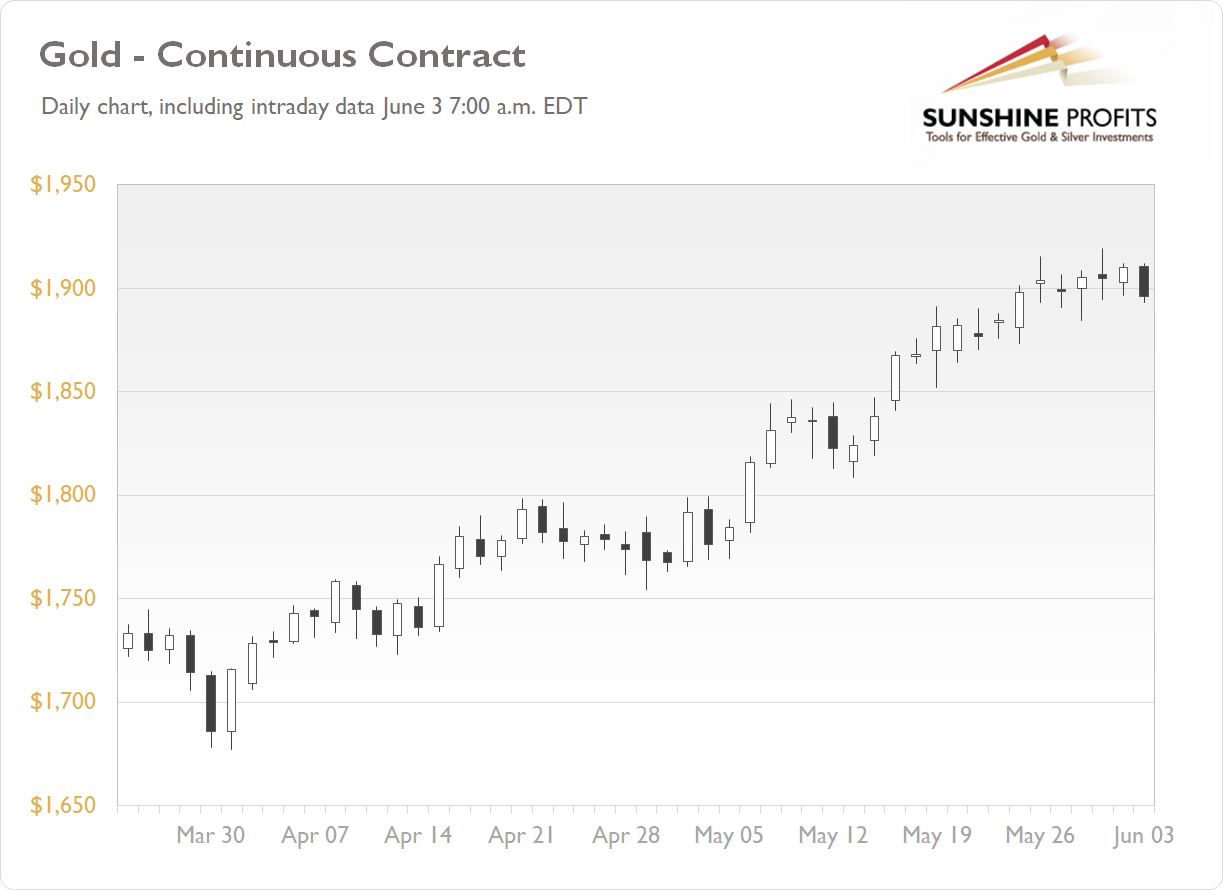 Where would the price of gold go following tomorrow’s NFP release? We’ve compiled the data since September of 2018, a 33-month-long period of time that contains of thirty three NFP releases. The first chart shows price paths 5 days before and 10 days after the NFP release. The last three cases are marked with dashed lines. Gold gained 2.48% in May and it gained 1.92% in April.