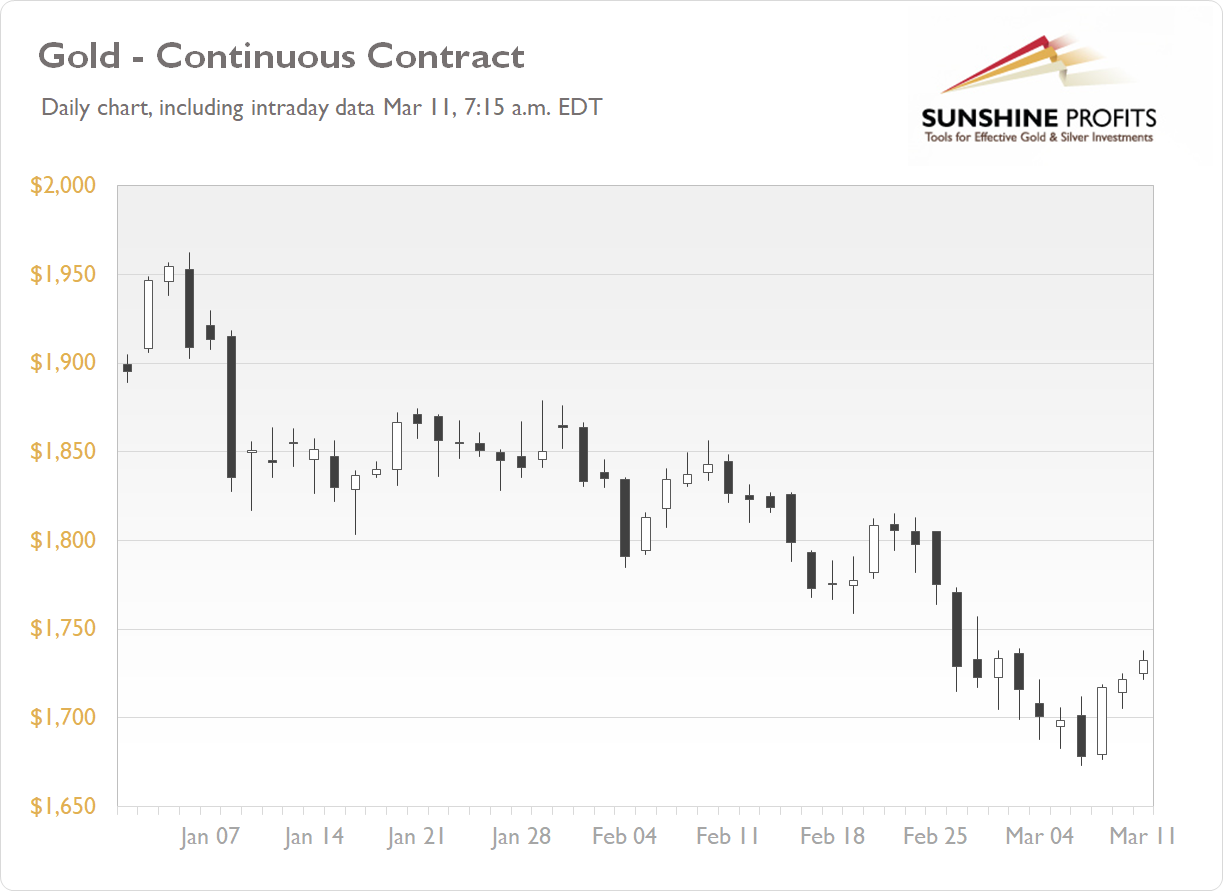 The gold futures contract gained 0.29% on Wednesday, as it retraced some more of its recent declines that led to $1,700 price level breakdown. The yellow metal sold off following U.S. dollar’s advance, stocks’ correction. On Monday the market was the lowest since early June last year. Today gold is extending its short-term uptrend, as we can see on the daily chart (the chart includes today’s intraday data):
