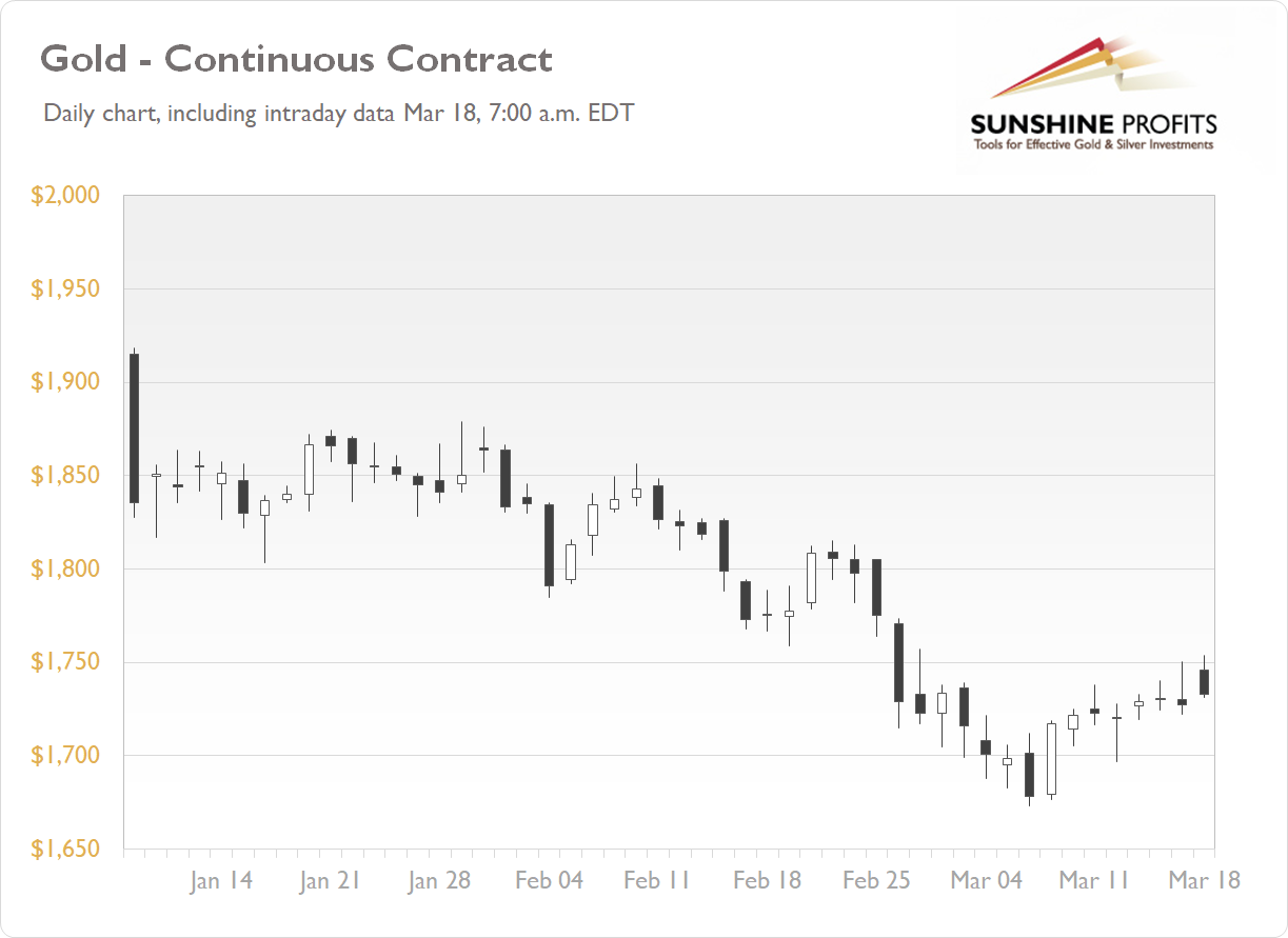 The gold futures contract lost 0.22% on Wednesday, as it extended a short-term consolidation following rebound from last Monday’s local low of $1,763.30. The Wednesday’s FOMC release led to an increased volatility. However, gold went basically sideways. A week ago yellow metal’s price was the lowest since early June. Today gold is retracing its intraday advance, as we can see on the daily chart (the chart includes today’s intraday data):