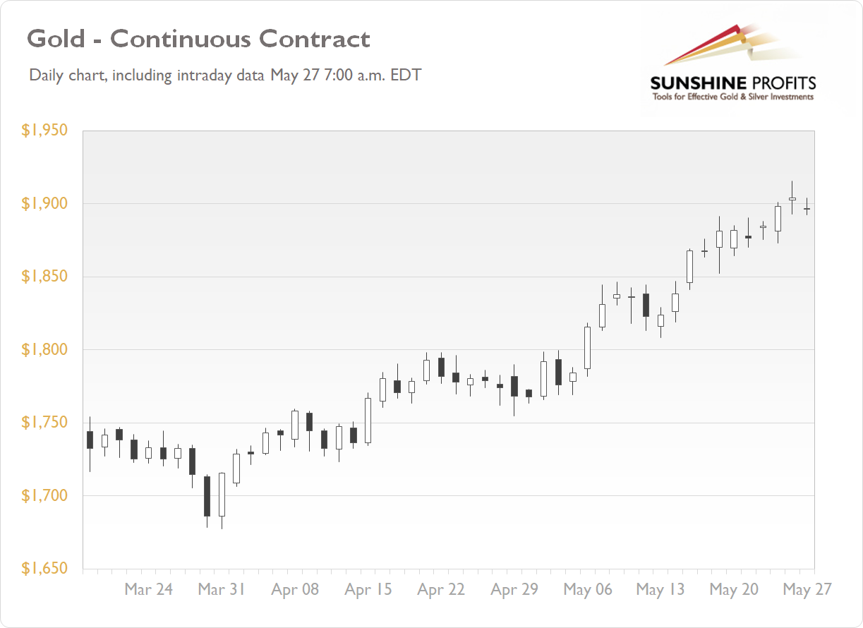 The gold futures contract gained 0.31% on Wednesday, as it extended its uptrend once again. It was the highest since early January. In April the market has bounced from the support level marked by March 8 local low of $1,663.30. Since then it has been advancing. Today gold is trading slightly below $1,900 price mark, as we can see on the daily chart (the chart includes today’s intraday data):