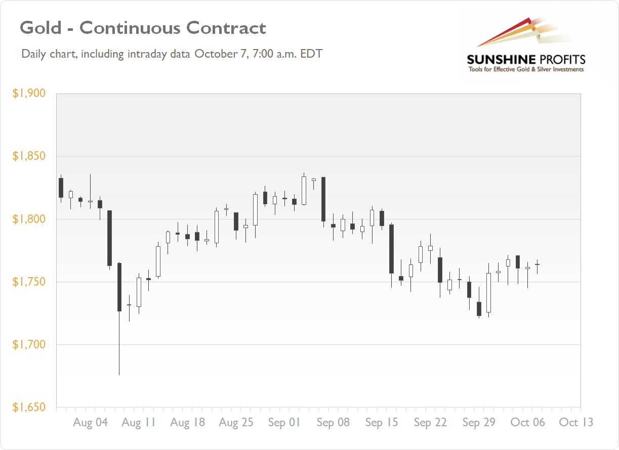 The gold futures contract gained 0.05% on Wednesday, as it continued to fluctuate after a short-term advance over the $1,750 price level. The market got back above that level following a downward correction in U.S. dollar and falling stock prices. This morning gold is trading close to its yesterday’s daily closing price, as we can see on the daily chart (the chart includes today’s intraday data):