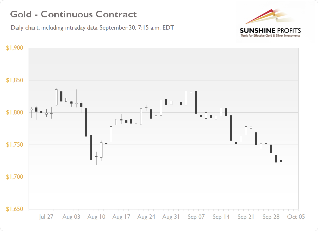 The gold futures contract lost 0.84% on Wednesday, as it further extended a short-term downtrend following breaking below $1,750 price level. Recently, the market continued to trade along the $1,750 price level after breaking below local lows of around $1,780 more than w week ago as series of the U.S. economic data releases along with the rallying U.S. dollar led to a sell-off in precious metals. This morning gold is trading along yesterday’s daily closing price, as we can see on the daily chart (the chart includes today’s intraday data):