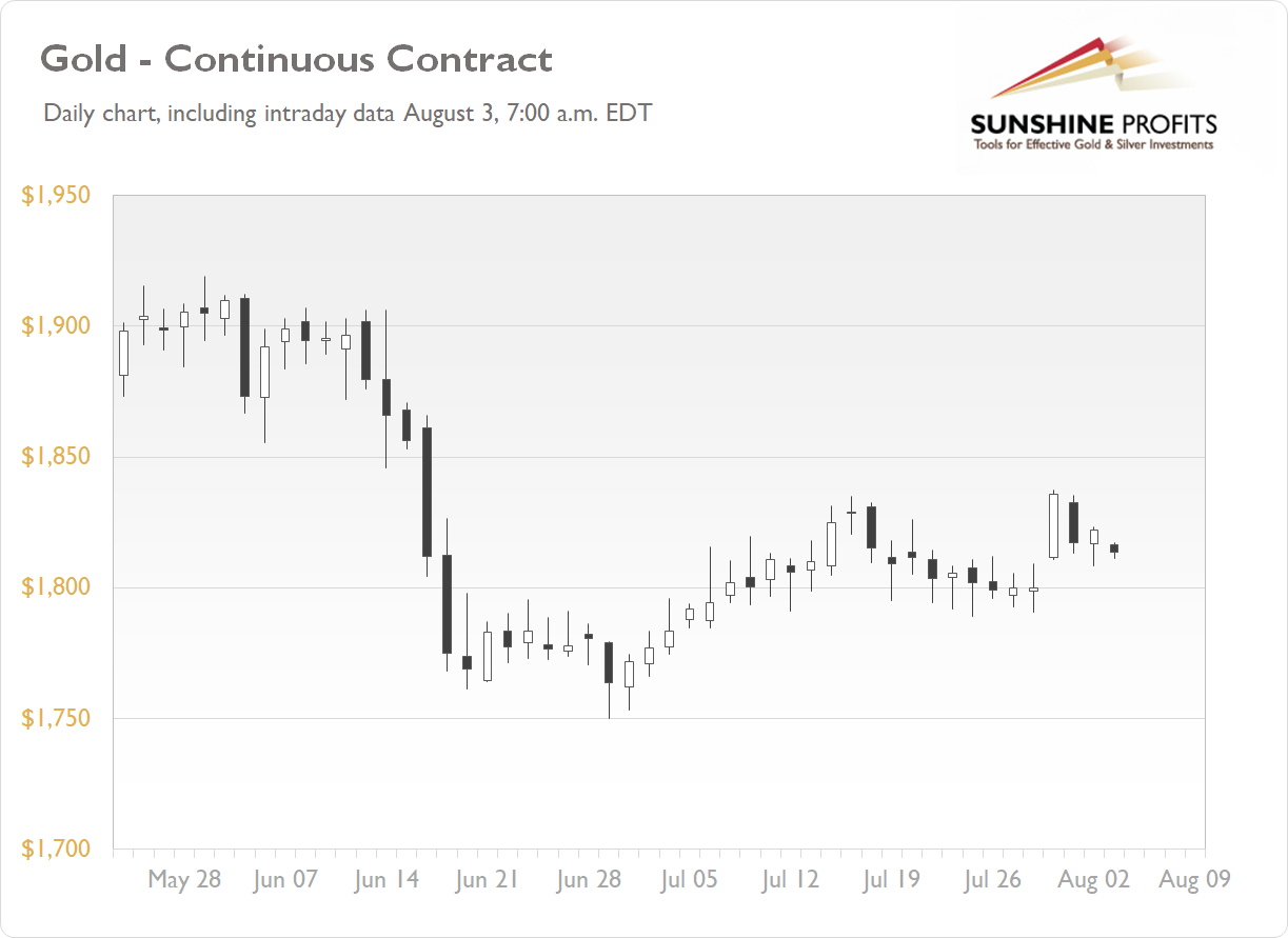 The gold futures contract gained 0.28% on Monday, as it fluctuated following Friday’s retreat. On Thursday, the market broke above its July 15 high of $1,835 and it gained 2%. Then on Friday it has lost around 1%. Precious metals’ prices followed weakening U.S. dollar. This morning gold is trading along yesterday’s daily close, as we can see on the daily chart (the chart includes today’s intraday data):