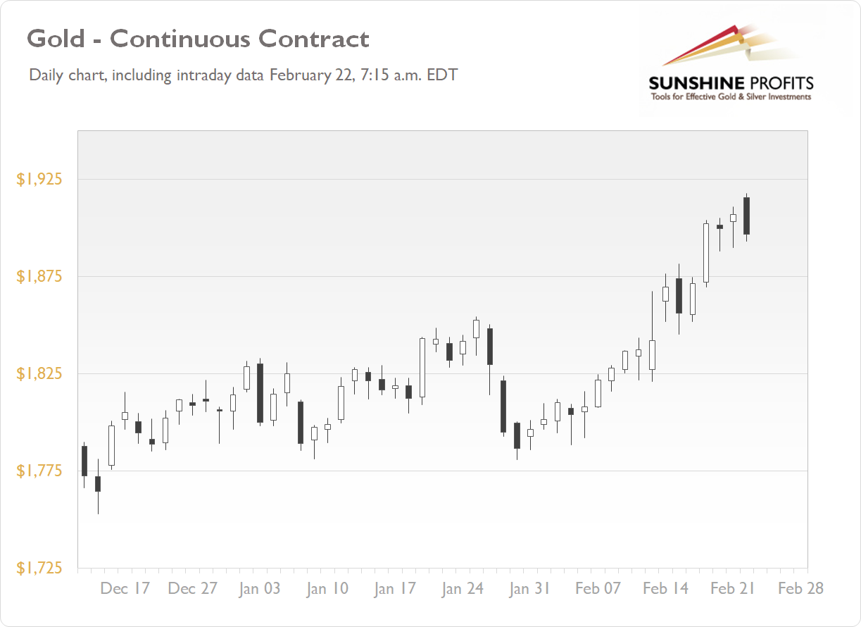 The gold futures contract gained 0.38% on Monday, as it extended its recent advances following breaking above the recent local highs. The market broke above the $1,900 level after more worrying news concerning Russia-Ukraine conflict. This morning gold is getting back below the $1,900 price level again. Before the intraday correction it reached the new local high closer to the $1,920 level, as we can see on the daily chart (the chart includes today’s intraday data):