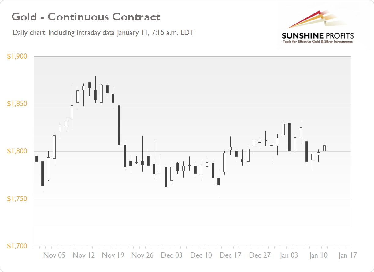 The gold futures contract gained 0.08% on Monday, as it fluctuated following the recent rebound. On Friday the market reacted to mixed monthly jobs data release. On Monday a week ago gold reached the new local high of $1,833 before reversing lower, and on Friday it traded as low as $1,781.30. This morning the yellow metal is above the $1,800 level again, as we can see on the daily chart (the chart includes today’s intraday data):
