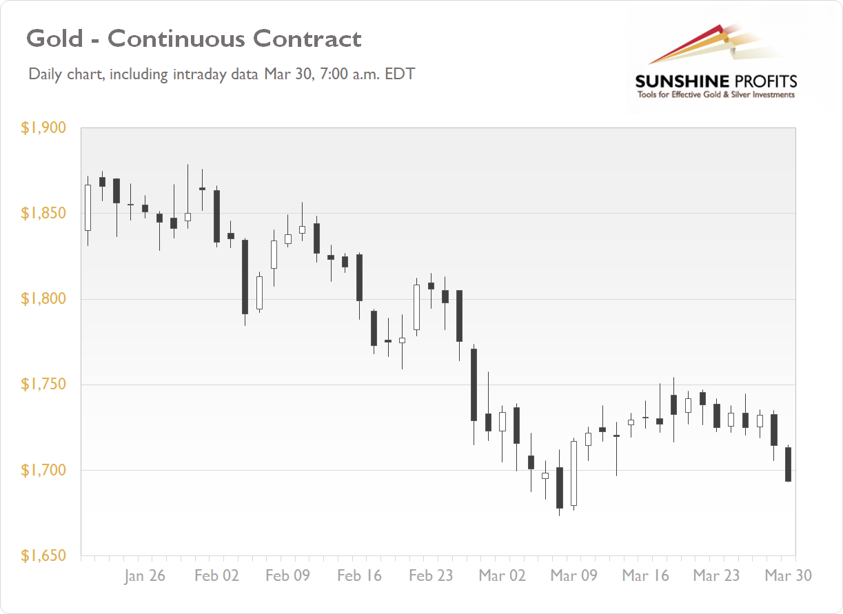 The gold futures contract lost 1.02% on Monday, as it broke below its short-term consolidation following rebound from March 8th local low of $1,763.30. In early March yellow metal’s price was the lowest since last year’s June. Today gold is extending the decline, as we can see on the daily chart (the chart includes today’s intraday data):