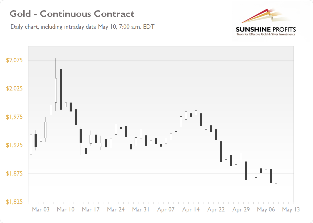 The gold futures contract lost 1.29% on Monday, May 9, as it extended a short-term consolidation below the $1,900 price level. Gold continues to fluctuate after declining from the resistance level of $2,000 in April on strengthening U.S. dollar, Fed’s monetary policy tightening fears. This morning the yellow metal is trading along its yesterday’s closing price, as we can see on the daily chart (the chart includes today’s intraday data):