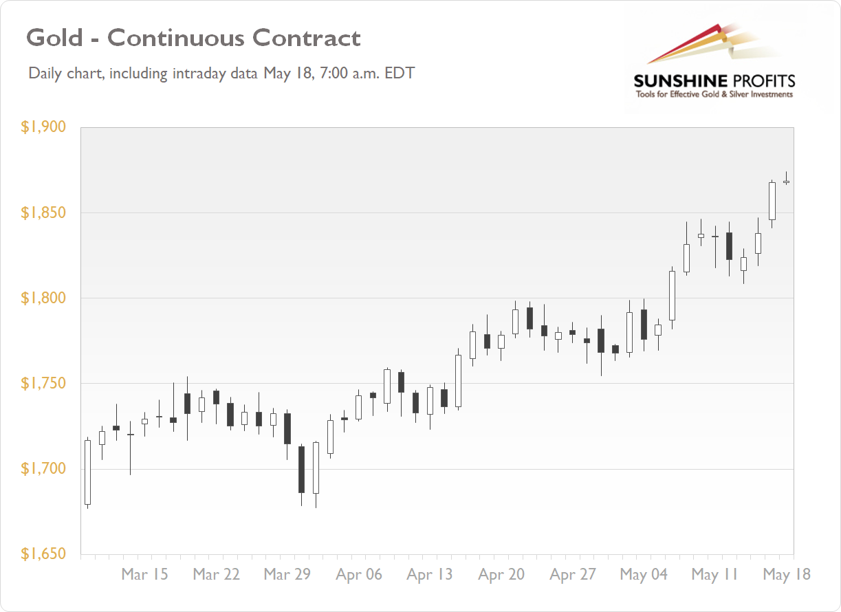 The gold futures contract gained 1.60% on Monday, as it broke above the short-term consolidation along $1,850 price level. In early April the market has bounced from the support level marked by March 8 local low of $1,663.30. Since then it has been advancing. Today gold is trading along yesterday’s daily closing price, as we can see on the daily chart (the chart includes today’s intraday data):