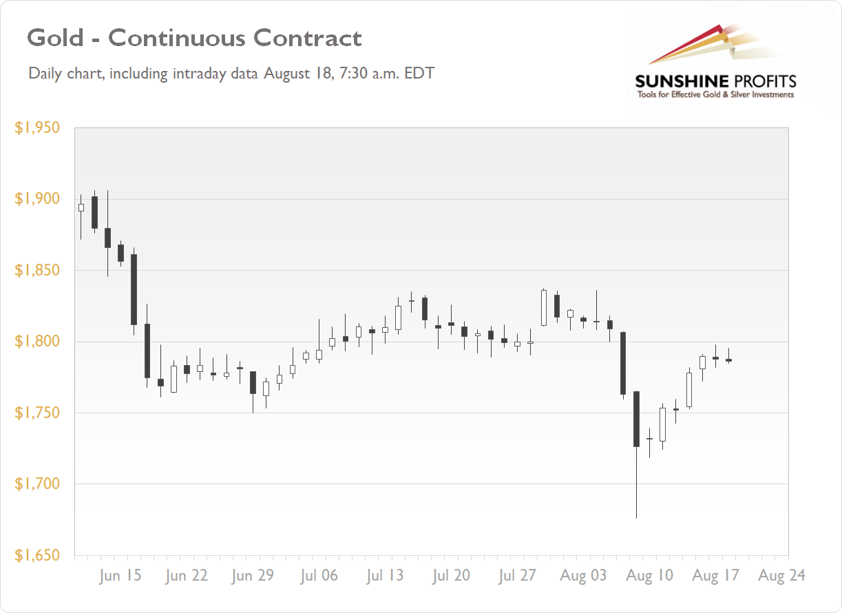 The gold futures contract lost 0.11% on Tuesday, as it fluctuated following the recent advances. The market extended its short-term uptrend from last Monday’s local low of 1,675.90 and it got close to $1,800 privce level. Gold has retraced more of its previous Friday’s-Monday’s sell-off. This morning gold is trading sideways, as we can see on the daily chart (the chart includes today’s intraday data):