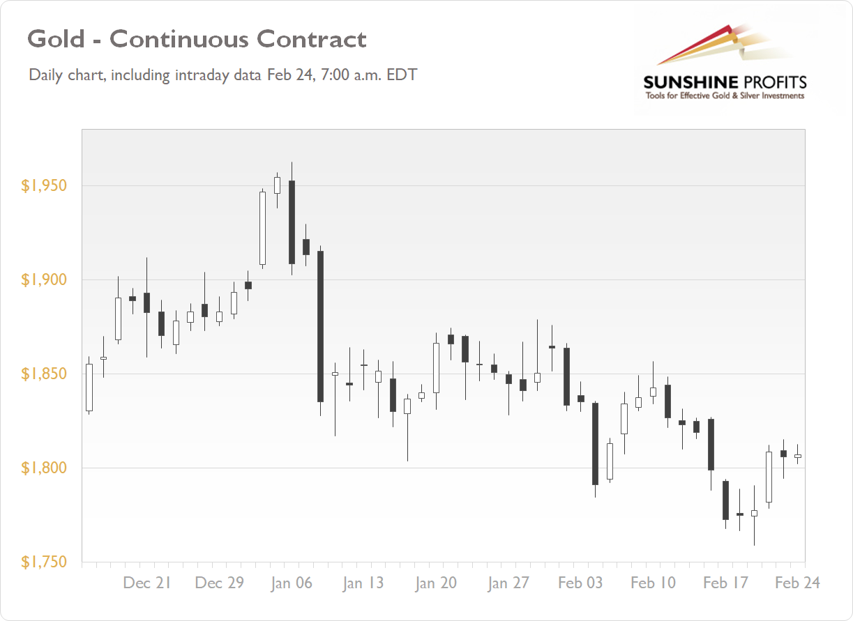 The gold futures contract lost 0.14% on Tuesday, as it fluctuated following Monday’s rebound of 1.7%. Last week it broke below the previous local low and $1,800 price level. The market gave back all of December’s advance. Today gold is extending a short-term consolidation, as we can see on the daily chart ( the chart includes today’s intraday data ):