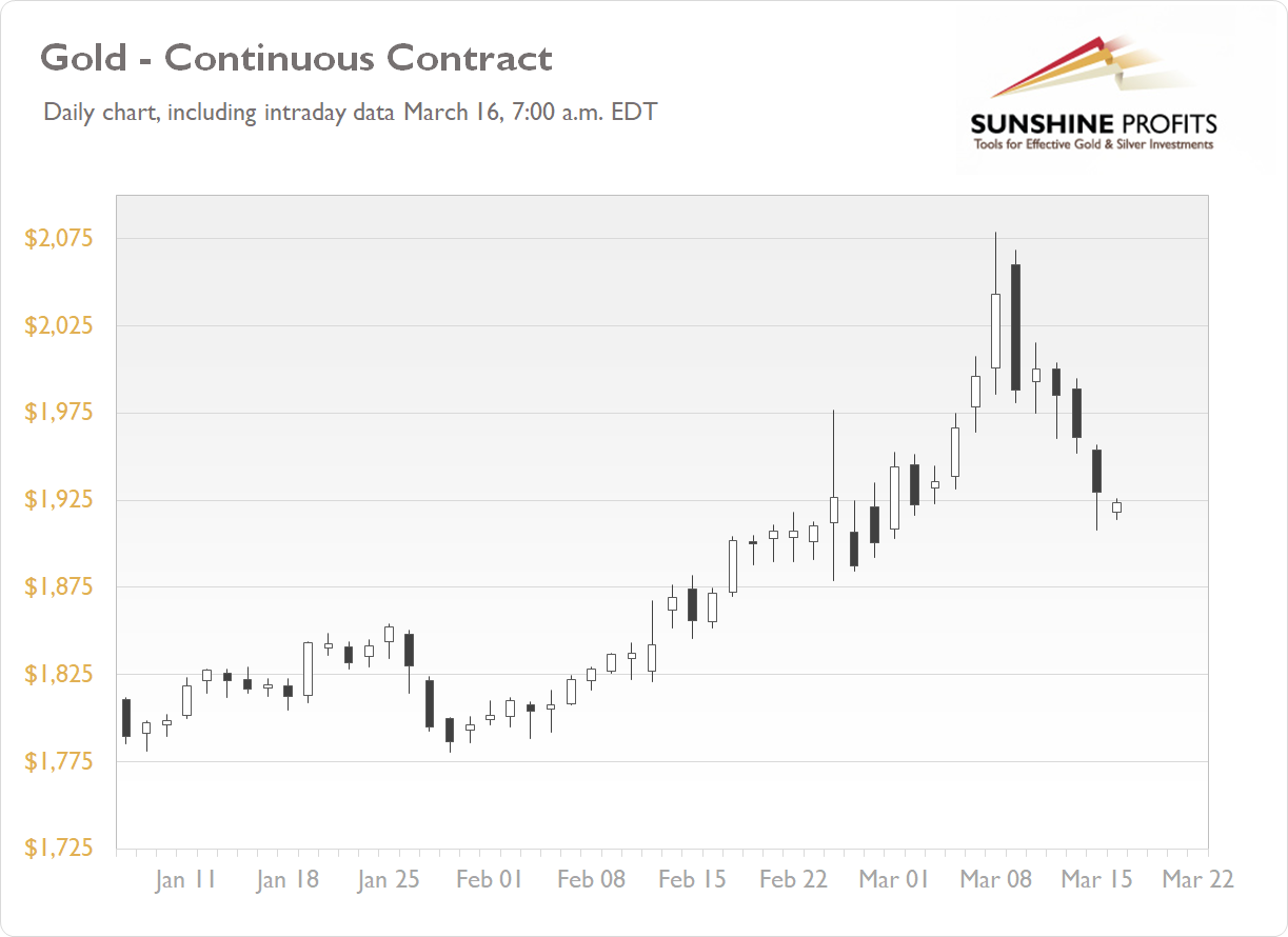 The gold futures contract lost 1.59% on Tuesday, Mar. 15, following its Monday’s decline of 1.6%, as it retraced even more of the recent rally. The market fell closer to the $1,900 level yesterday. Today we will get the important FOMC Statement release at 2:00 p.m. This morning gold is trading within a relatively narrow price range, as we can see on the daily chart (the chart includes today’s intraday data):