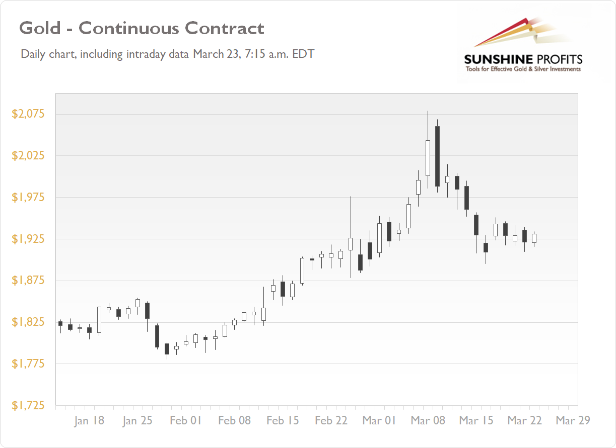 The gold futures contract lost 0.41% on Tuesday, Mar. 22, as it continued to fluctuate within a short-term consolidation. The market extended its fluctuations above the $1,900 level after retracing most of the rally to the March 8 local high of $2,078.80. This morning gold is still trading within a consolidation, as we can see on the daily chart (the chart includes today’s intraday data):