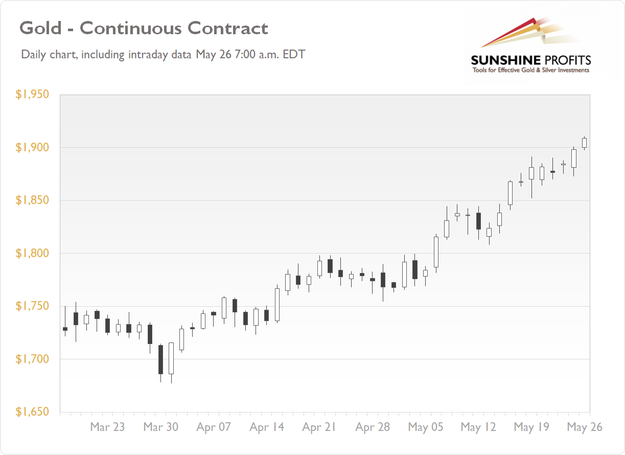 The gold futures contract gained 0.72% on Tuesday, as it broke above its short-term consolidation. In early April the market has bounced from the support level marked by March 8 local low of $1,663.30. Since then it has been advancing. Today gold is trading above $1,900 price mark and it’s the highest since early January, as we can see on the daily chart (the chart includes today’s intraday data):