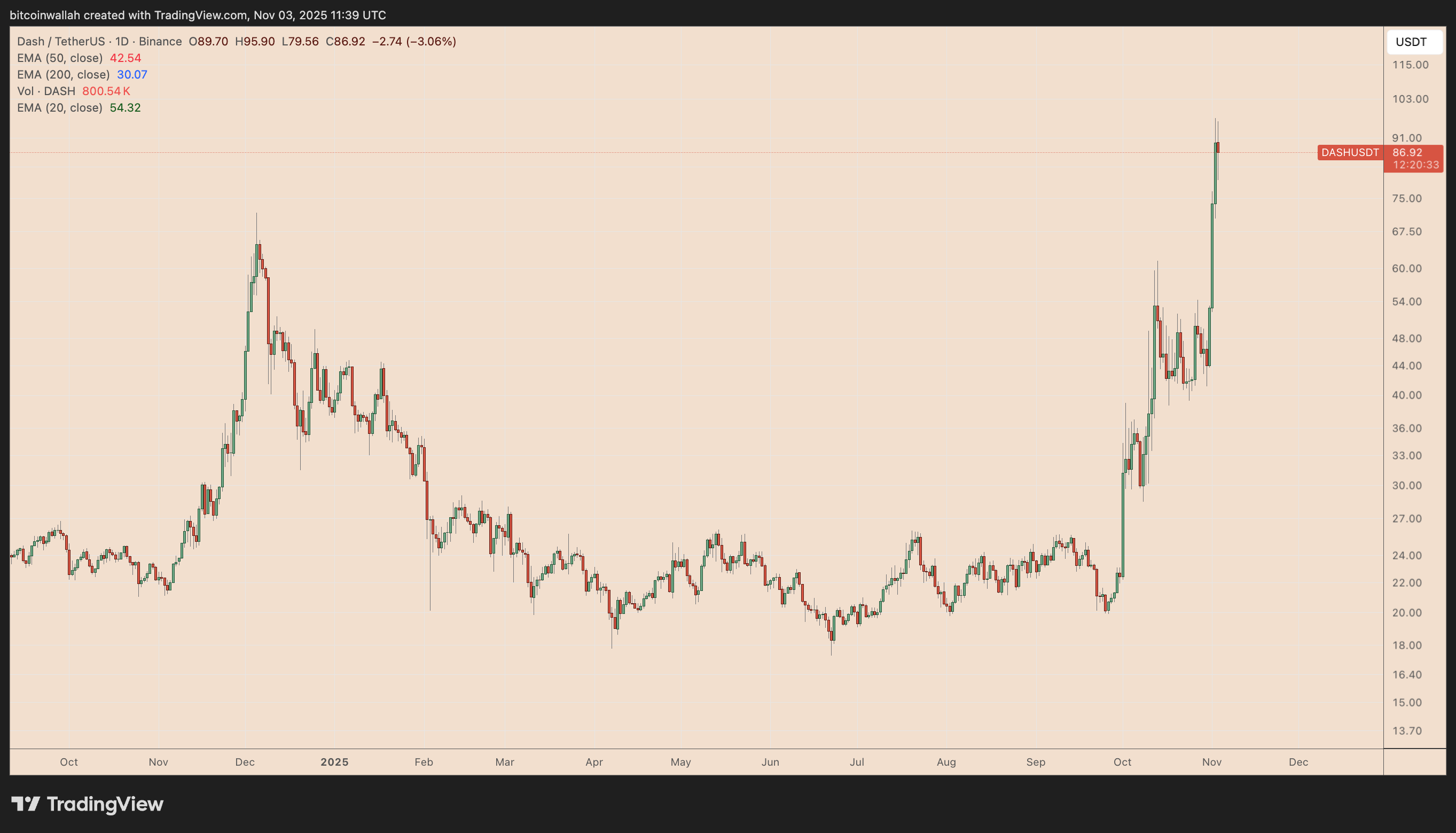Dash (DASH), a privacy-focused cryptocurrency, has emerged as one of the top performers in the crypto market in November, rising by over 80% month-to-date to around $97, its highest level since May 2022.